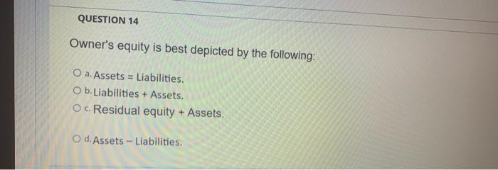A residual equity assets B assets - liabilities C assets liabilities D liabilities assets. Assets Liabilities Owners Equity.
